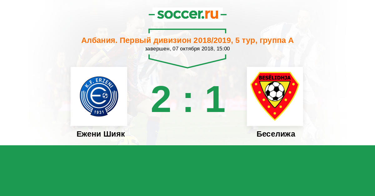 Албания. Первый дивизион 22.12.2018 Беселижа Логотип футбольный клуб Беселижа (Леже) 1:1 Логотип футбольный клуб Эрзени Шияк Эрзени Шияк