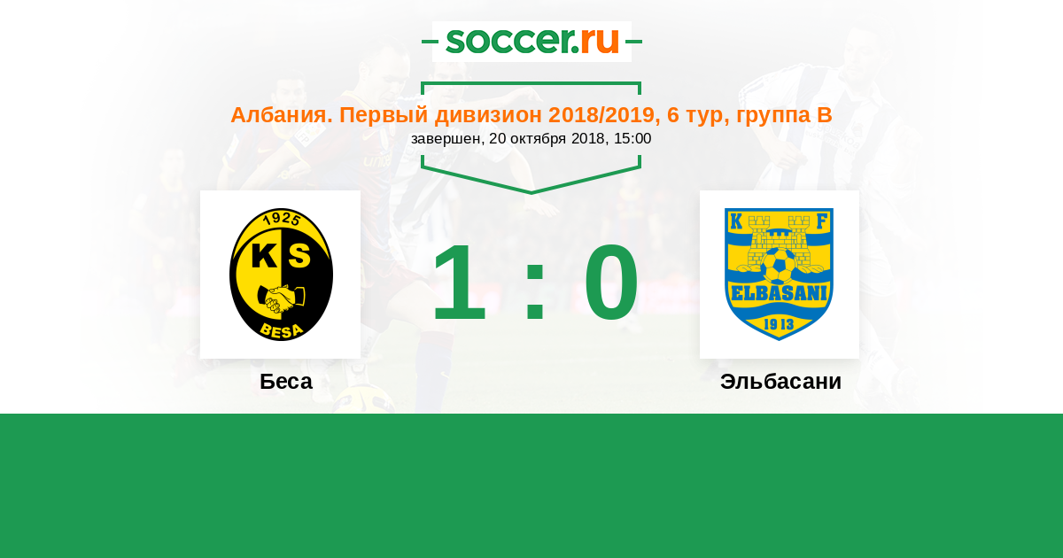 Албания. Первый дивизион 21.09.2019 Беса Логотип футбольный клуб Беса (Кавайе) 2:0 Логотип футбольный клуб Эльбасани Эльбасани