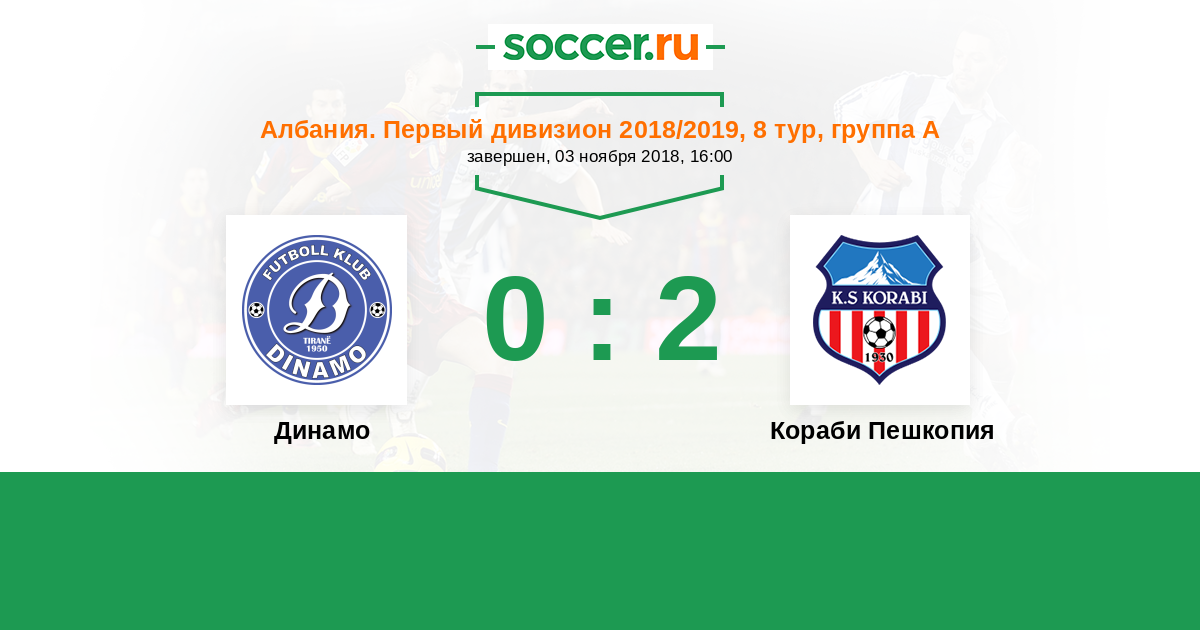 Албания. Первый дивизион 04.05.2019 Кораби Пешкопия Логотип футбольный клуб Кораби Пешкопия 0:1 Логотип футбольный клуб Динамо Сити (Тирана) Динамо Сити