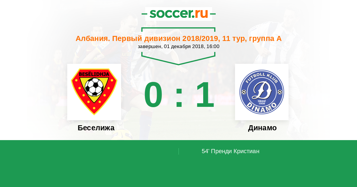 Албания. Первый дивизион 15.09.2018 Динамо Сити Логотип футбольный клуб Динамо Сити (Тирана) 2:0 Логотип футбольный клуб Беселижа (Леже) Беселижа
