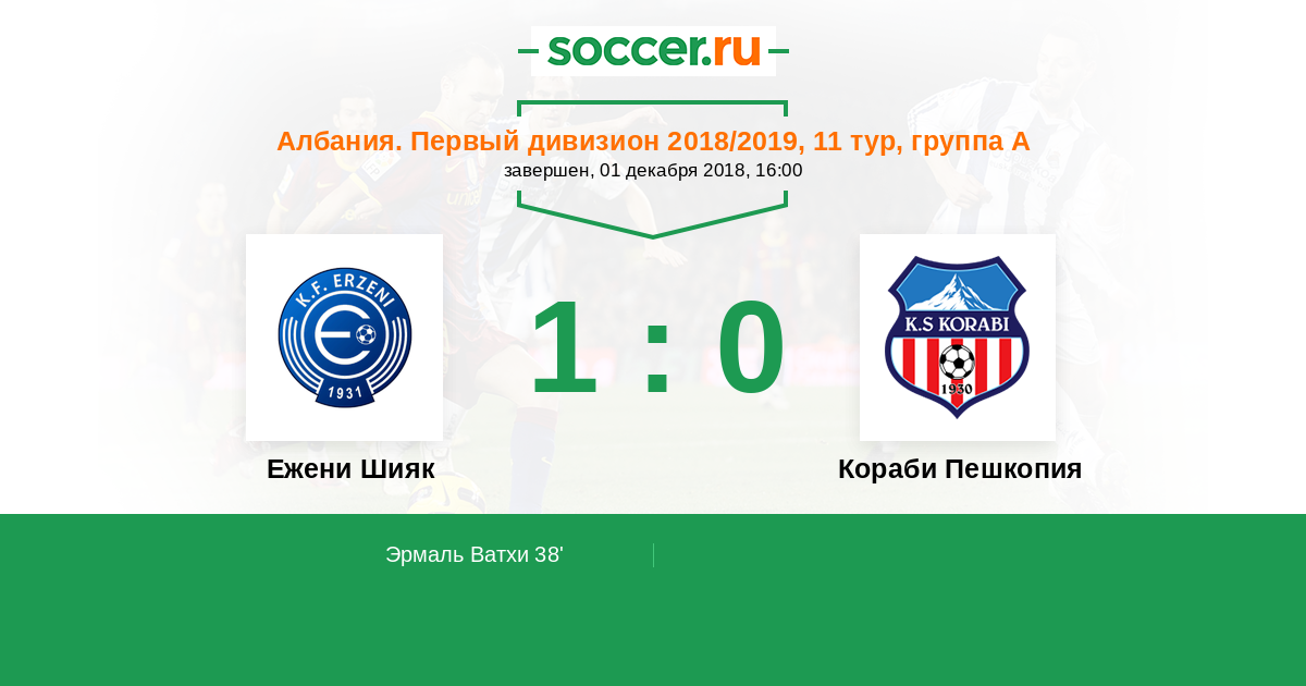 Албания. Первый дивизион 15.09.2018 Кораби Пешкопия Логотип футбольный клуб Кораби Пешкопия 1:0 Логотип футбольный клуб Эрзени Шияк Эрзени Шияк