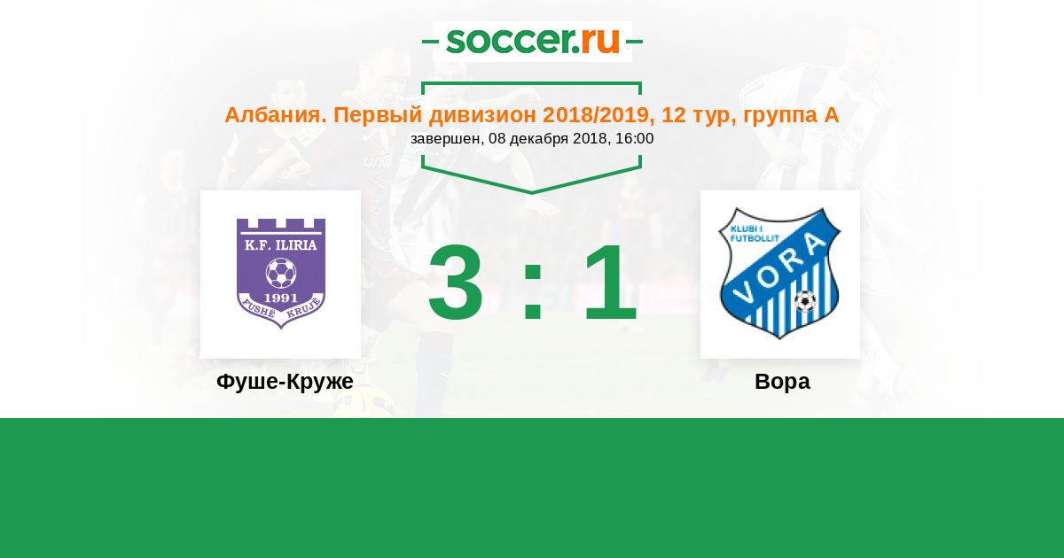 Албания. Первый дивизион 18.05.2019 Фуше-Круже Логотип футбольный клуб Фуше-Круже 3:2 Логотип футбольный клуб Вора Вора