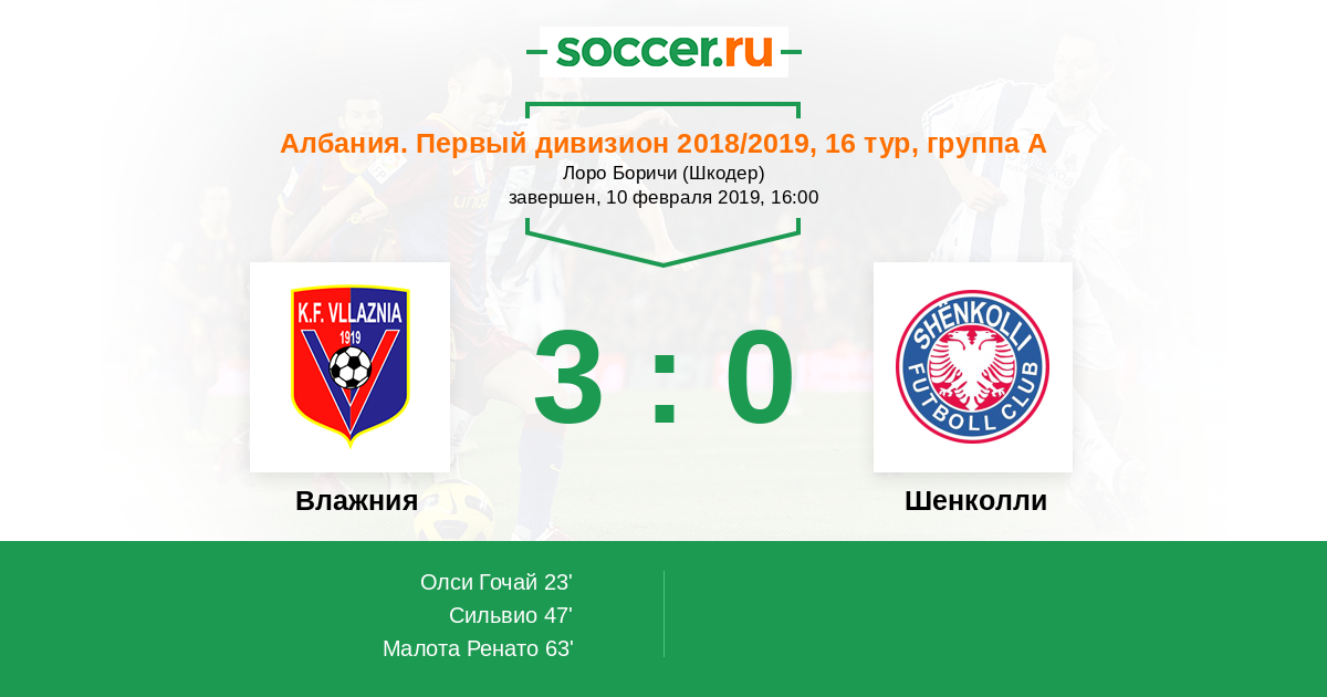Албания. Первый дивизион 16.02.2019 Шенколли Логотип футбольный клуб Шенколли (Леже) 1:0 Логотип футбольный клуб Эрзени Шияк Эрзени Шияк