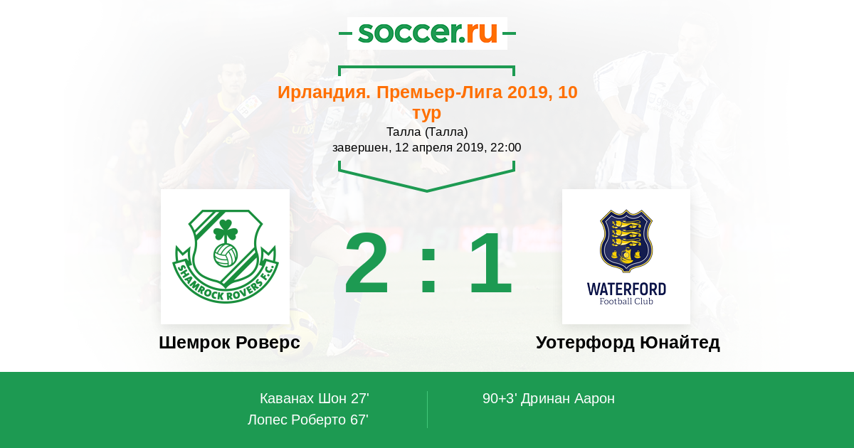 Ирландия. Премьер-лига 27.08.2019 Шемрок Роверс Логотип футбольный клуб Шемрок Роверс (Дублин) 2:1 Логотип футбольный клуб Уотерфорд Юнайтед Уотерфорд Юнайтед