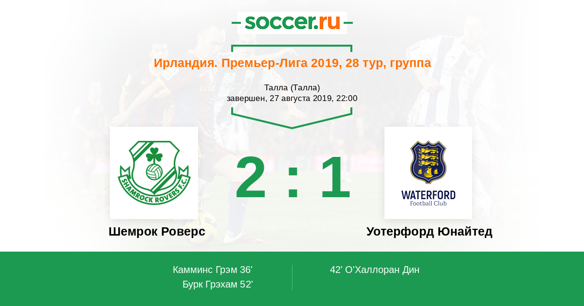Ирландия. Премьер-лига 19.08.2019 Уотерфорд Юнайтед Логотип футбольный клуб Уотерфорд Юнайтед 1:5 Логотип футбольный клуб Шемрок Роверс (Дублин) Шемрок Роверс