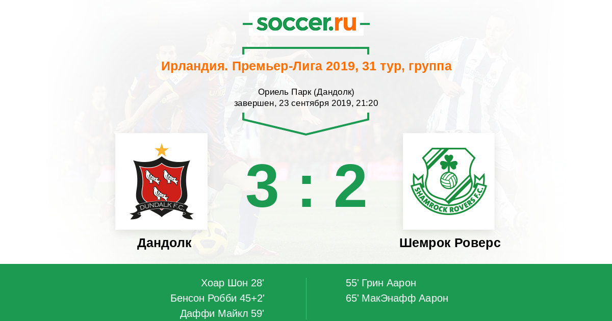 Ирландия. Премьер-лига 28.06.2019 Шемрок Роверс Логотип футбольный клуб Шемрок Роверс (Дублин) 0:1 Логотип футбольный клуб Дандолк Дандолк