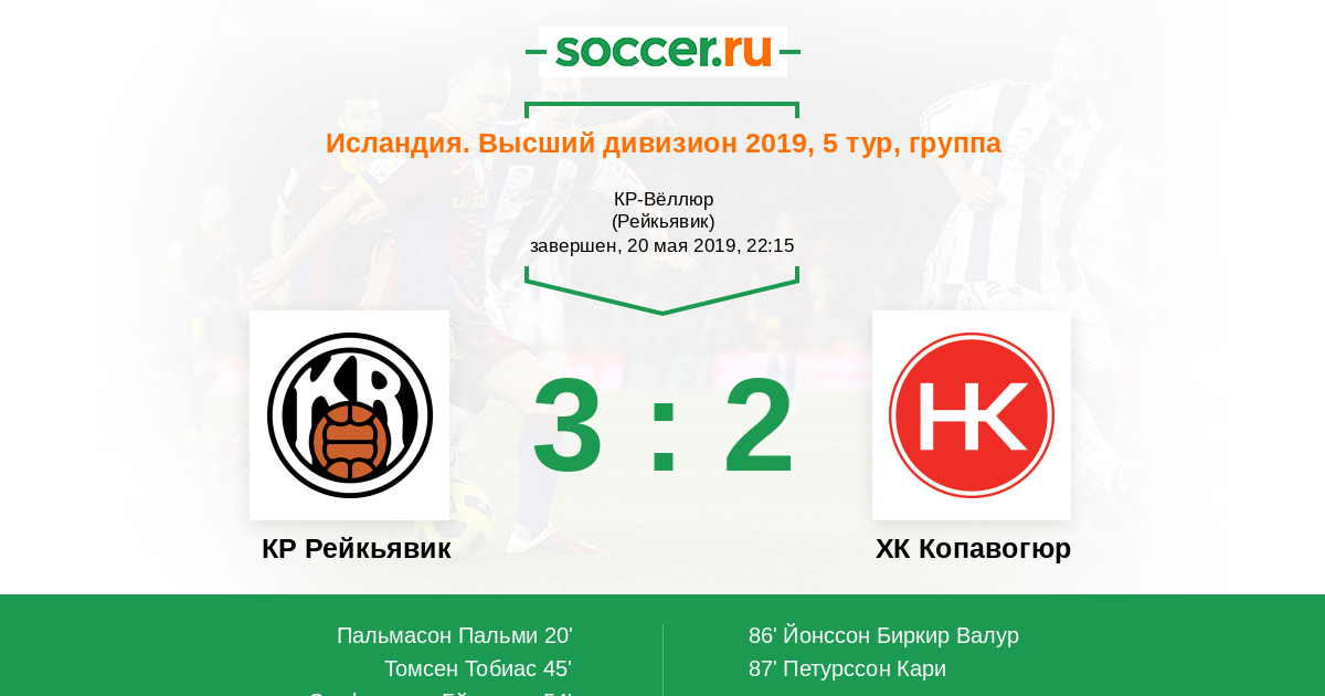 Исландия. Высший дивизион 20.06.2020 КР Рейкьявик Логотип футбольный клуб КР Рейкьявик 0:3 Логотип футбольный клуб ХК Копавогюр (Копавогур) ХК Копавогюр