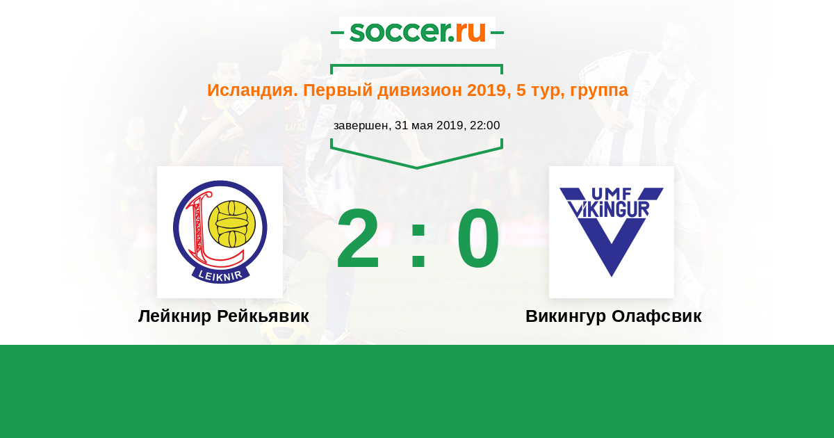 Исландия. Первый дивизион 13.06.2018 Викингур Олафсвик Логотип футбольный клуб Викингур Олафсвик 3:0 Логотип футбольный клуб Лейкнир Рейкьявик Лейкнир Рейкьявик