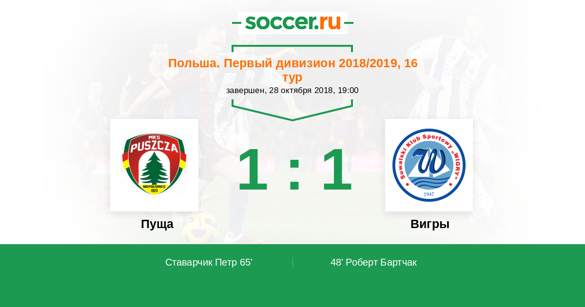 Польша. Первый дивизион 26.08.2017 Пуща Логотип футбольный клуб Пуща (Ньеполомице) 2:1 Логотип футбольный клуб Вигры (Сувалки) Вигры