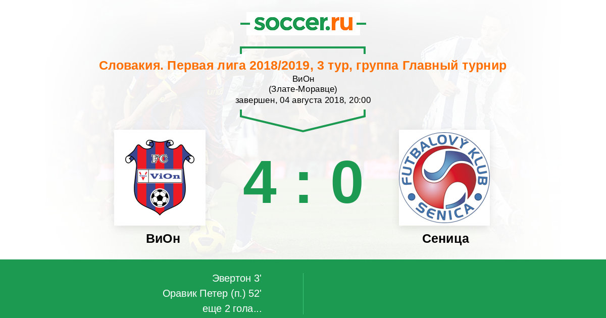 Словакия. Суперлига 23.08.2019 Сеница Логотип футбольный клуб Сеница 1:3 Логотип футбольный клуб ВиОн (Злате-Моравце) ВиОн