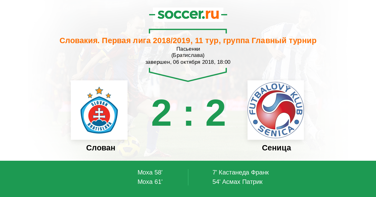 Словакия. Суперлига 28.10.2017 Слован Логотип футбольный клуб Слован (Братислава) 2:2 Логотип футбольный клуб Сеница Сеница
