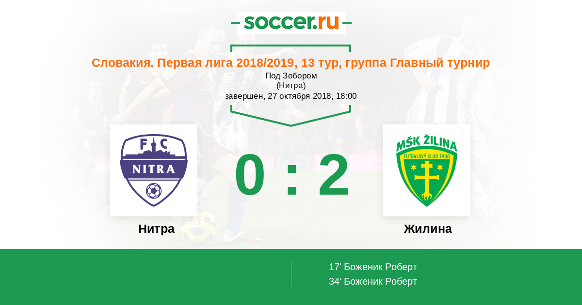 Словакия. Суперлига 15.10.2017 Жилина Логотип футбольный клуб Жилина 2:0 Логотип футбольный клуб Нитра Нитра