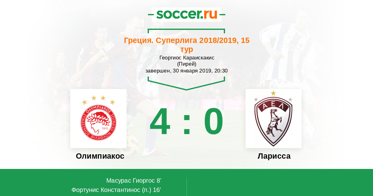 Греция. Суперлига 05.05.2019 Ларисса Логотип футбольный клуб Ларисса 0:3 Логотип футбольный клуб Олимпиакос (Пирей) Олимпиакос