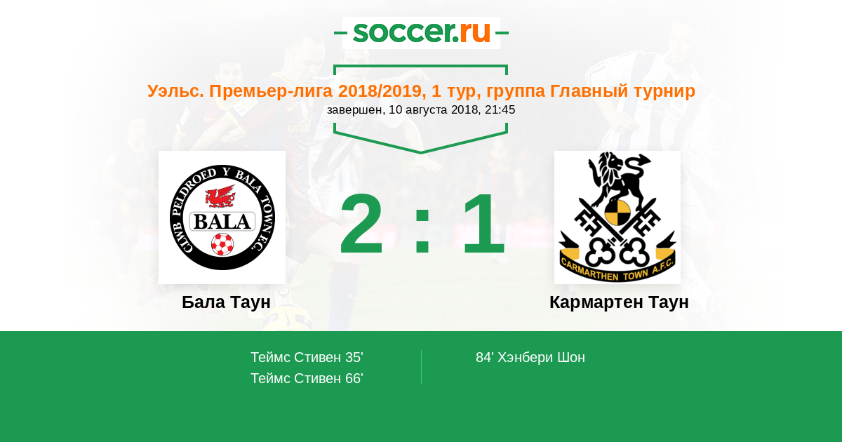 Уэльс. Премьер-Лига 20.10.2018 Кармартен Таун Логотип футбольный клуб Кармартен Таун 1:2 Логотип футбольный клуб Бала Таун Бала Таун