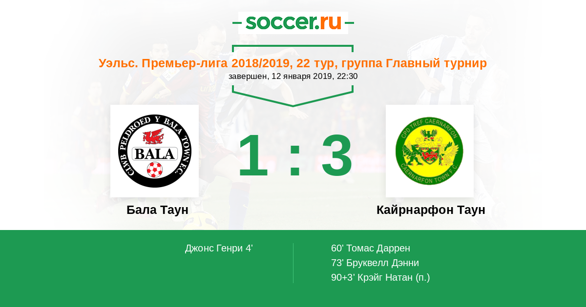 Уэльс. Премьер-Лига 08.03.2019 Кайрнарфон Таун Логотип футбольный клуб Кайрнарфон Таун 1:0 Логотип футбольный клуб Бала Таун Бала Таун