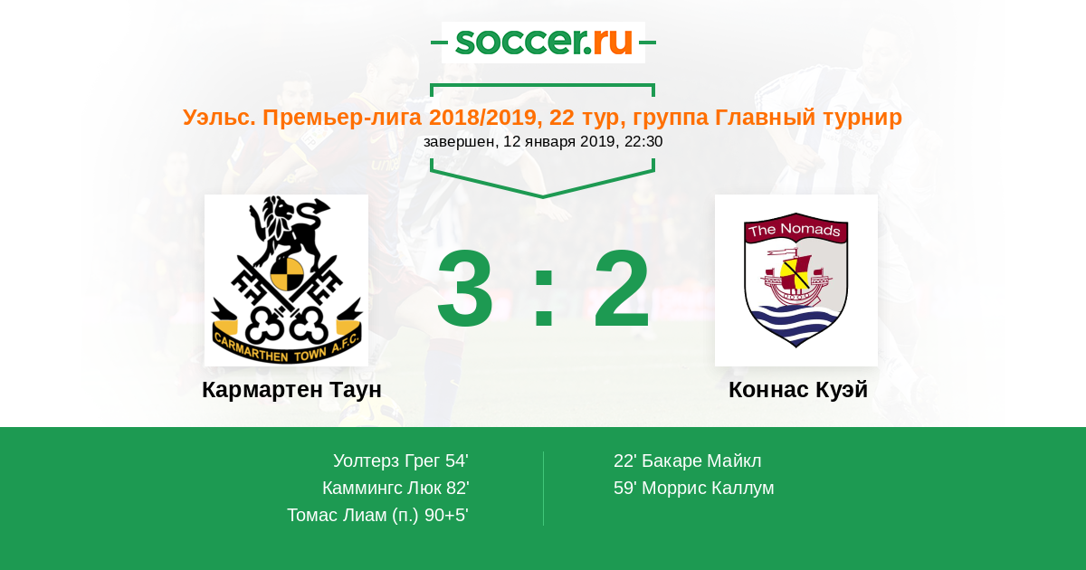 Уэльс. Кубок 26.01.2019 Кармартен Таун Логотип футбольный клуб Кармартен Таун 1:3 Логотип футбольный клуб Коннас Куэй Коннас Куэй