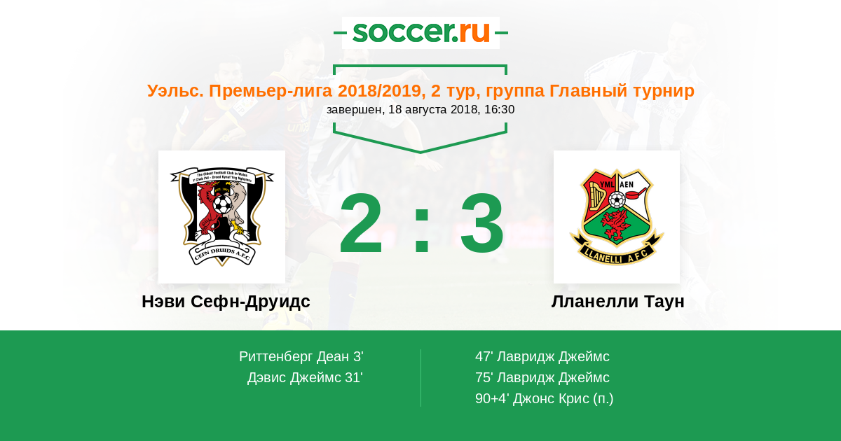 Уэльс. Премьер-Лига 17.11.2018 Лланелли Таун Логотип футбольный клуб Лланелли Таун 2:0 Логотип футбольный клуб Нэви Сефн-Друидс (Сефн Моур) Нэви Сефн-Друидс