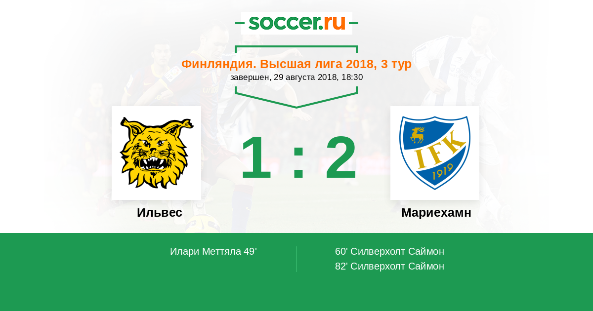 Финляндия. Высшая лига 02.09.2018 Мариехамн Логотип футбольный клуб Мариехамн 3:6 Логотип футбольный клуб Ильвес (Тампере) Ильвес