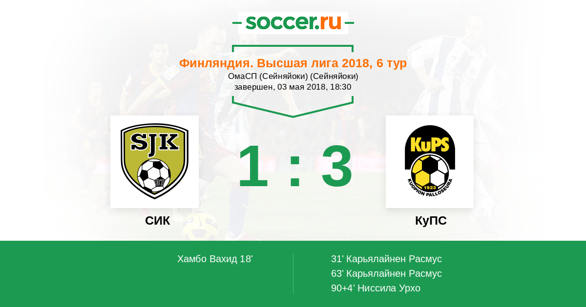 Финляндия. Высшая лига 30.06.2018 КуПС Логотип футбольный клуб КуПС (Купио) 1:1 Логотип футбольный клуб СИК (Сейняйоки) СИК