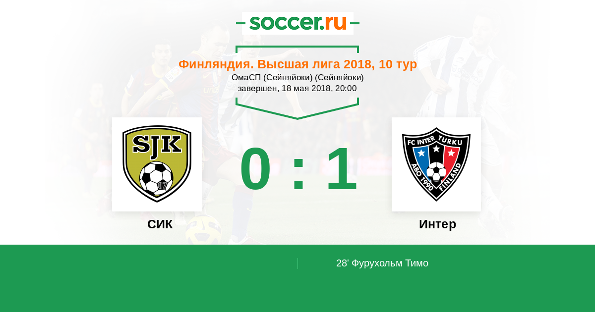 Финляндия. Высшая лига 14.07.2018 Интер Логотип футбольный клуб Интер (Турку) 2:0 Логотип футбольный клуб СИК (Сейняйоки) СИК