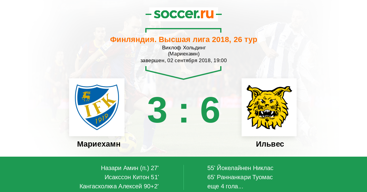 Финляндия. Высшая лига 29.08.2018 Ильвес Логотип футбольный клуб Ильвес (Тампере) 1:2 Логотип футбольный клуб Мариехамн Мариехамн