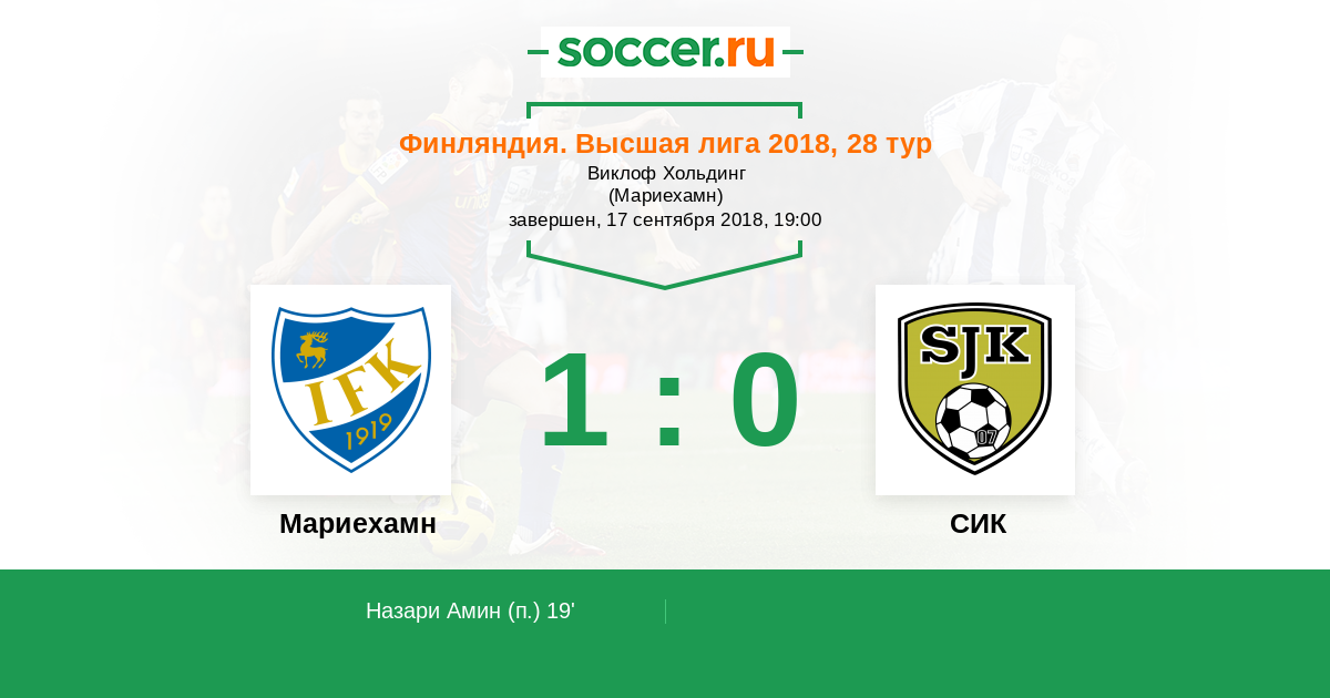 Финляндия. Высшая лига 29.07.2018 Мариехамн Логотип футбольный клуб Мариехамн 1:0 Логотип футбольный клуб СИК (Сейняйоки) СИК