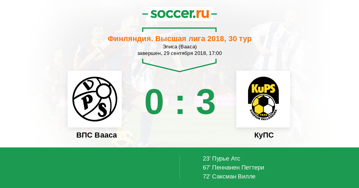 Финляндия. Высшая лига 16.09.2017 ВПС Вааса Логотип футбольный клуб ВПС Вааса 1:3 Логотип футбольный клуб КуПС (Купио) КуПС
