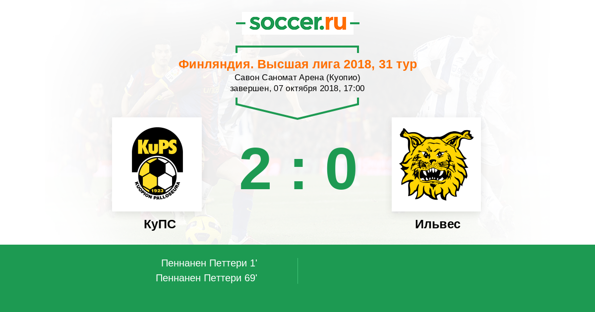 Финляндия. Высшая лига 01.07.2017 Ильвес Логотип футбольный клуб Ильвес (Тампере) 1:0 Логотип футбольный клуб КуПС (Купио) КуПС