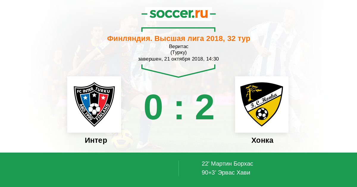 Финляндия. Высшая лига 22.09.2014 Интер Логотип футбольный клуб Интер (Турку) 2:2 Логотип футбольный клуб Хонка (Эспоо) Хонка
