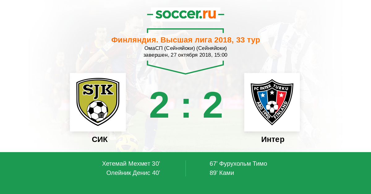 Финляндия. Высшая лига 01.07.2019 СИК Логотип футбольный клуб СИК (Сейняйоки) 2:1 Логотип футбольный клуб Интер (Турку) Интер