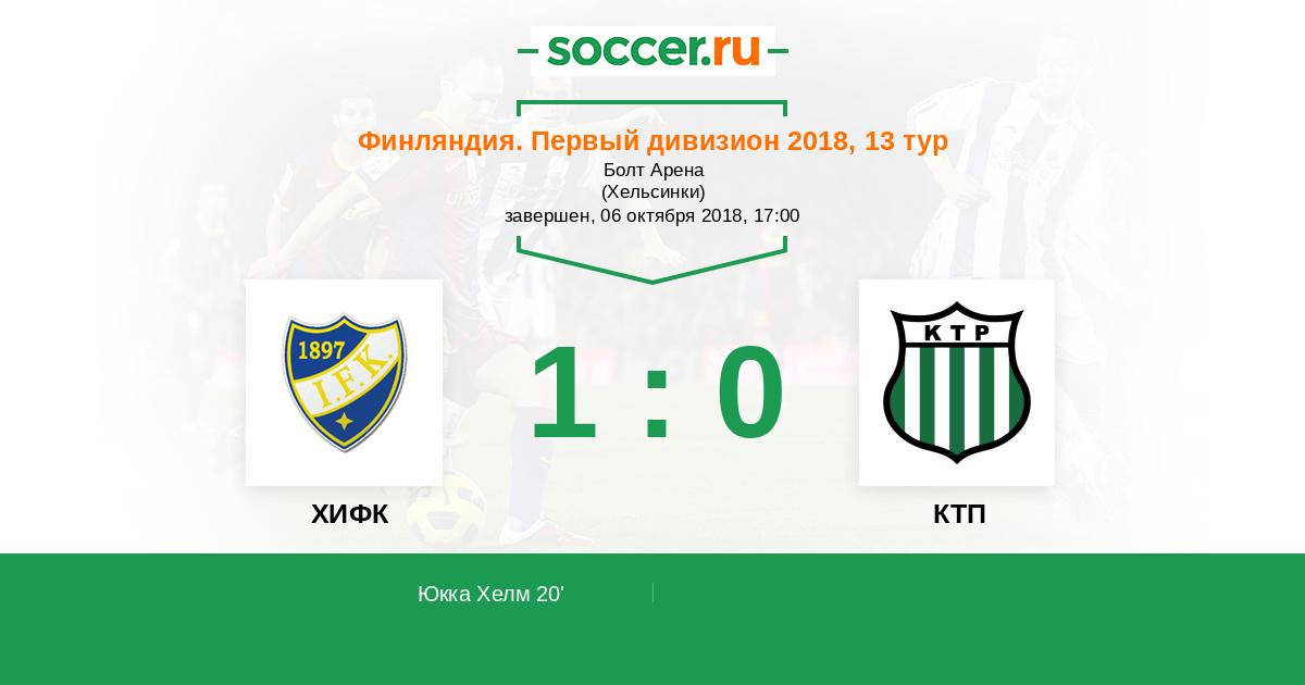 Финляндия. Первый дивизион 06.08.2018 КТП Логотип футбольный клуб КТП (Котка) 2:1 Логотип футбольный клуб ХИФК (Хельсинки) ХИФК