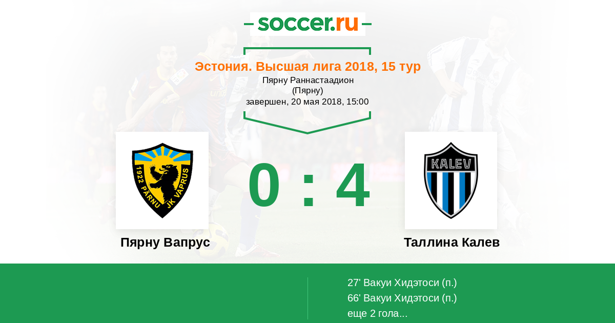 Эстония. Высшая лига 12.08.2018 Пярну Вапрус Логотип футбольный клуб Пярну Вапрус 2:4 Логотип футбольный клуб Таллина Калев Таллина Калев