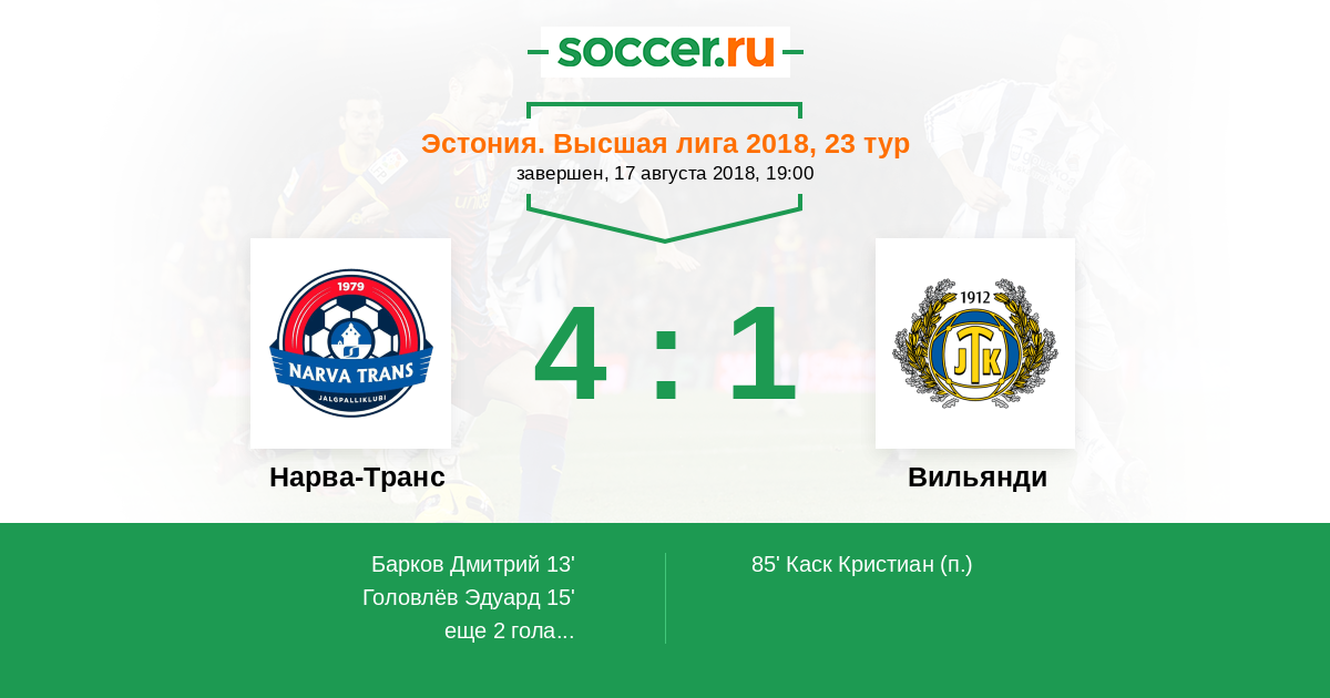 Эстония. Высшая лига 04.08.2017 Нарва-Транс Логотип футбольный клуб Нарва-Транс 1:2 Логотип футбольный клуб Вильянди Вильянди