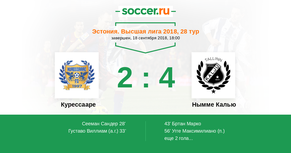 Эстония. Высшая лига 21.04.2018 Курессааре Логотип футбольный клуб Курессааре 0:3 Логотип футбольный клуб Нымме Калью (Таллин) Нымме Калью