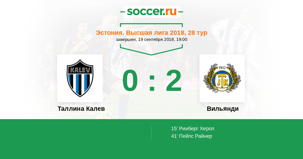 Эстония. Высшая лига 27.07.2018 Вильянди Логотип футбольный клуб Вильянди 2:2 Логотип футбольный клуб Таллина Калев Таллина Калев