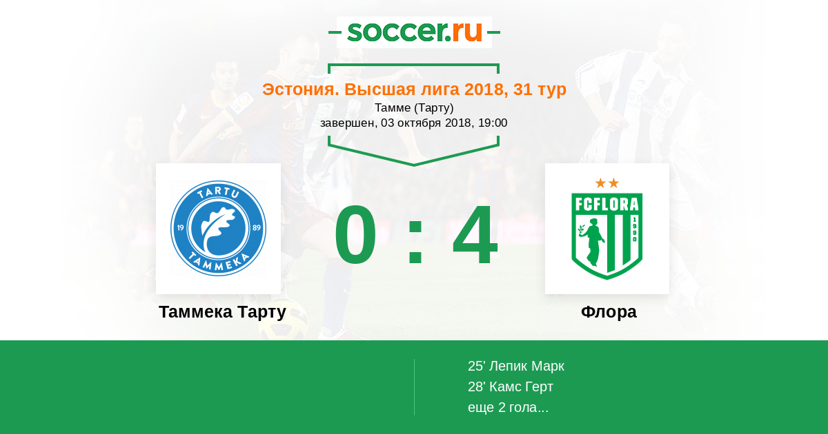 Эстония. Высшая лига 24.08.2018 Флора Логотип футбольный клуб Флора (Таллин) 5:0 Логотип футбольный клуб Таммека Тарту Таммека Тарту