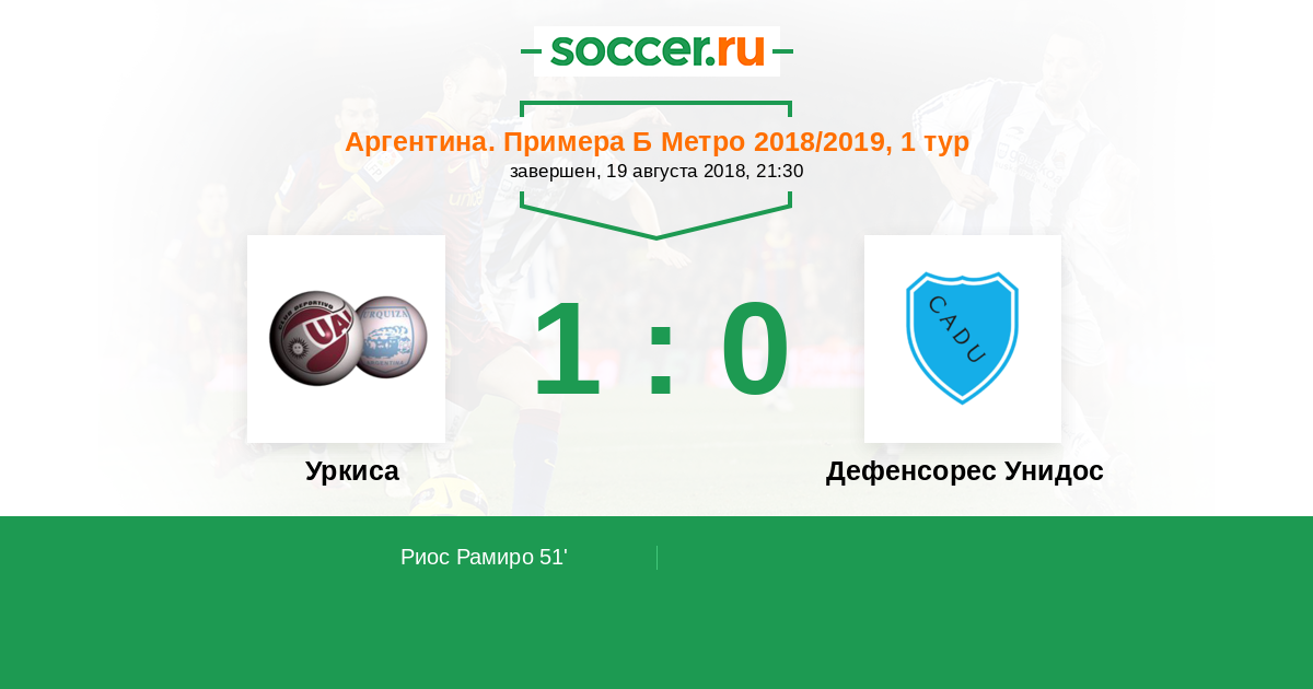 Аргентина. Примера С Метро 20.08.2011 Уркиса Логотип футбольный клуб Уркиса (Вилья Линч) 1:0 Логотип футбольный клуб Дефенсорес Унидос (Сарате) Дефенсорес Унидос