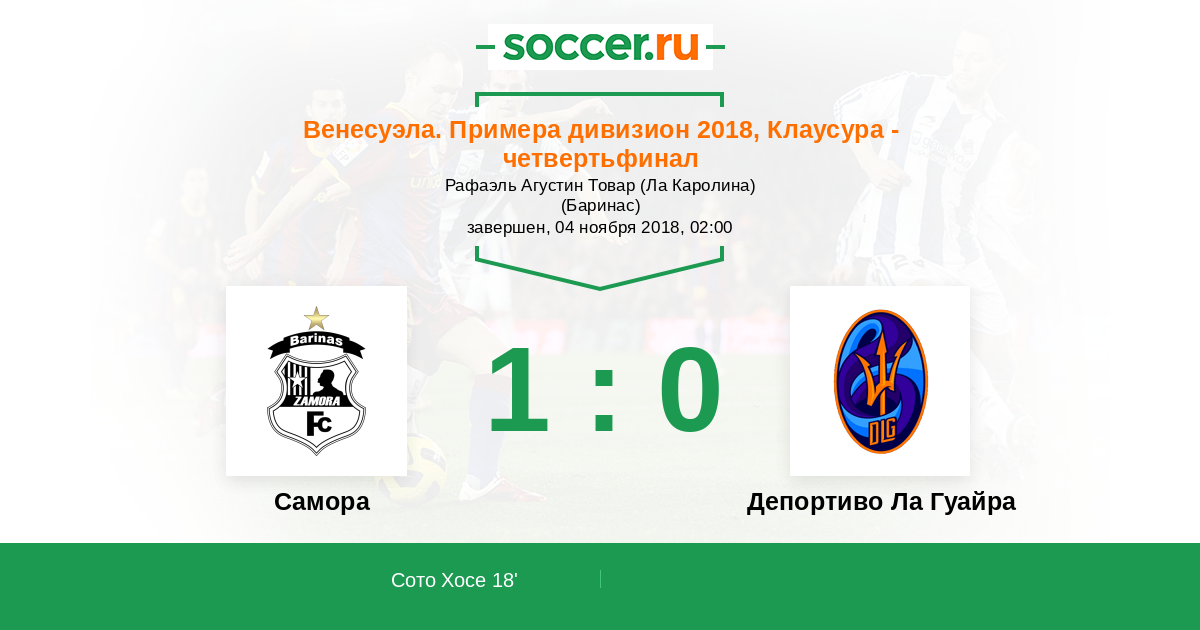Венесуэла. Примера дивизион 23.07.2018 Замора Логотип футбольный клуб Замора (Баринас) 3:1 Логотип футбольный клуб Депортиво Ла Гуайра (Каракас) Депортиво Ла Гуайра