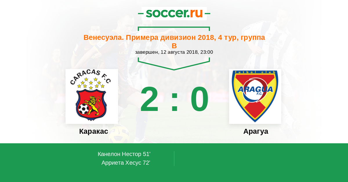 Венесуэла. Примера дивизион 19.08.2012 Арагуа Логотип Арагуа (Маракай) 0:2 Логотип футбольный клуб Каракас Каракас