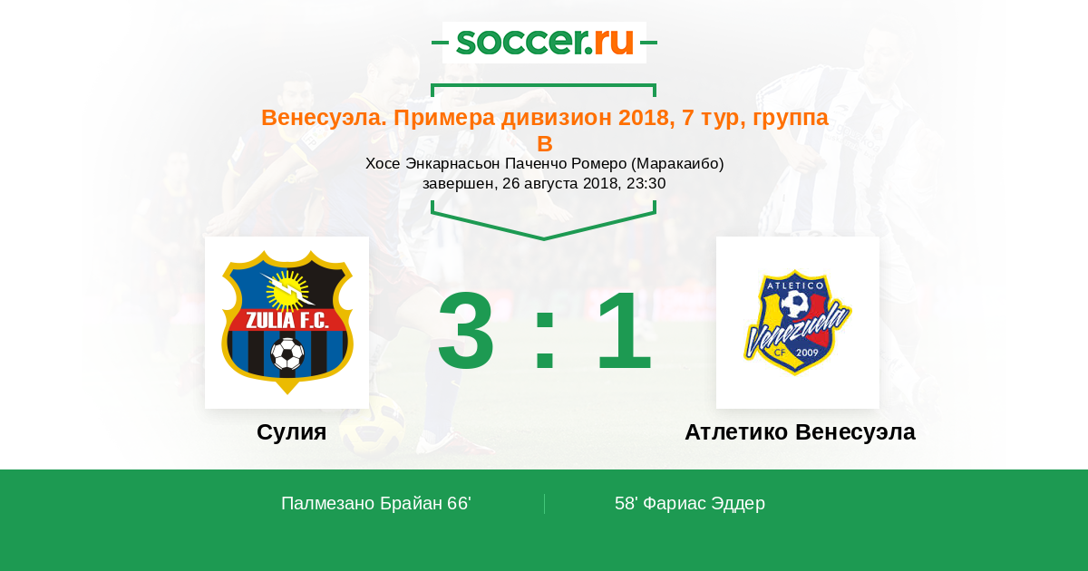 Венесуэла. Примера дивизион 25.09.2019 Сулия Логотип футбольный клуб Сулия (Маракайбо) 2:0 Логотип Атлетико Венесуэла (Майкуетья) Атлетико Венесуэла