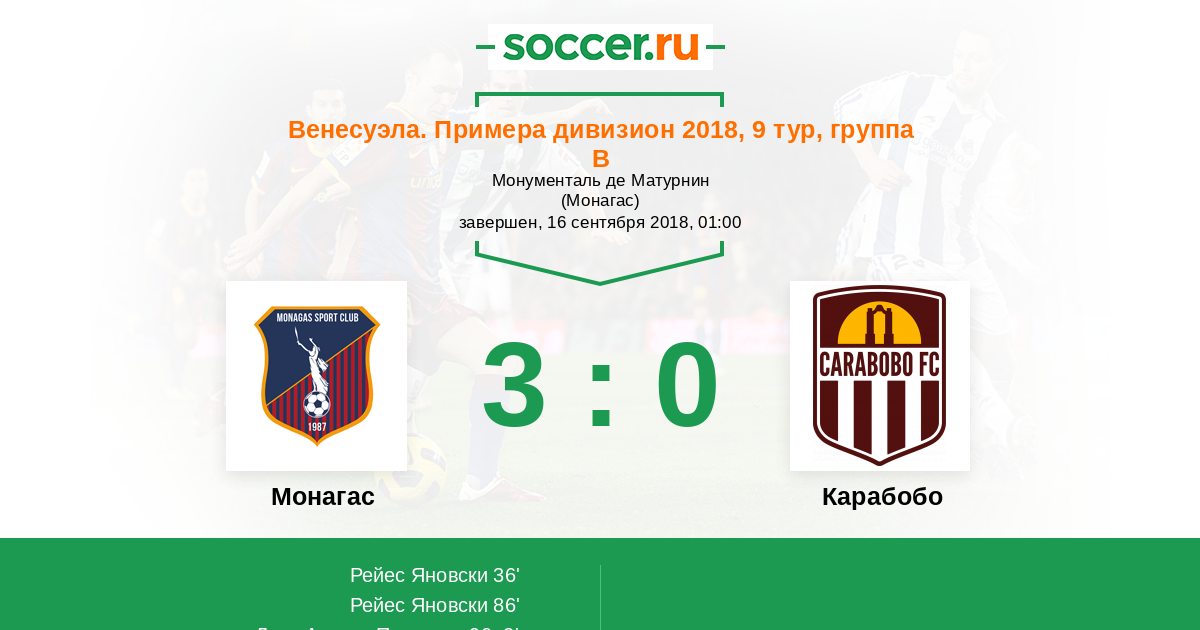 Венесуэла. Примера дивизион 17.03.2018 Карабобо Логотип футбольный клуб Карабобо (Валенсия) 2:2 Логотип футбольный клуб Монагас (Матурин) Монагас