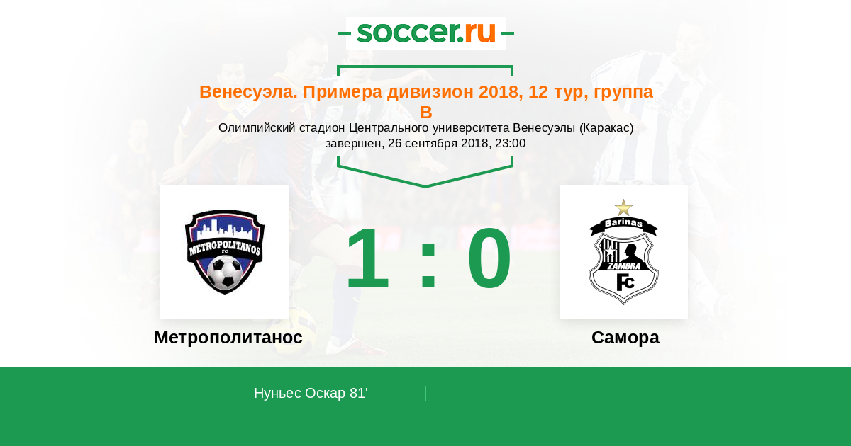 Венесуэла. Примера дивизион 16.04.2018 Замора Логотип футбольный клуб Замора (Баринас) 2:2 Логотип футбольный клуб Метрополитанос (Лос-Текес) Метрополитанос