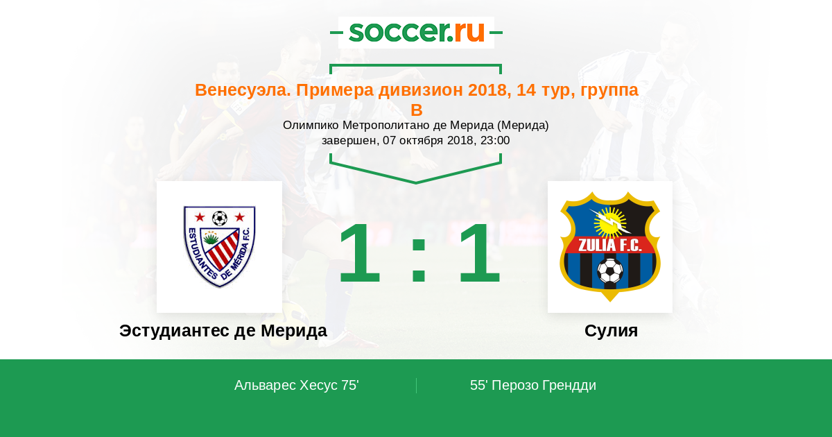 Венесуэла. Примера дивизион 29.04.2018 Сулия Логотип футбольный клуб Сулия (Маракайбо) 1:2 Логотип футбольный клуб Эстудиантес Мерида Эстудиантес Мерида