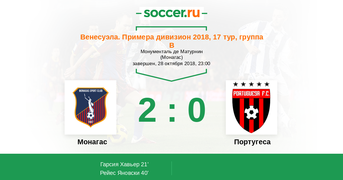 Венесуэла. Примера дивизион 18.05.2018 Португеса Логотип футбольный клуб Португеса (Акаригуа) 1:0 Логотип футбольный клуб Монагас (Матурин) Монагас