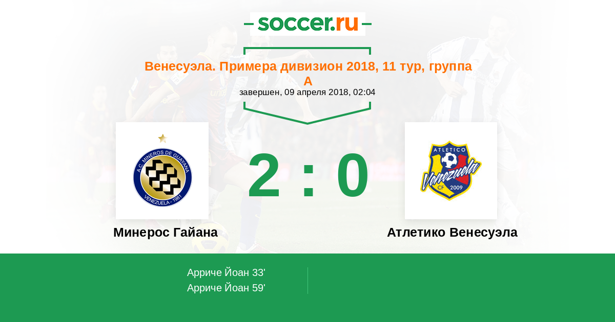 Венесуэла. Примера дивизион 23.04.2017 Атлетико Венесуэла Логотип Атлетико Венесуэла (Майкуетья) 2:1 Логотип футбольный клуб Минерос Гайана Минерос Гайана
