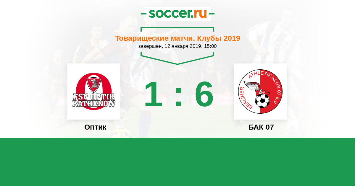 Товарищеские матчи. Клубы 06.01.2018 Оптик Логотип футбольный клуб Оптик (Ратенов) 0:3 Логотип футбольный клуб БАК 07 (Берлин) БАК 07