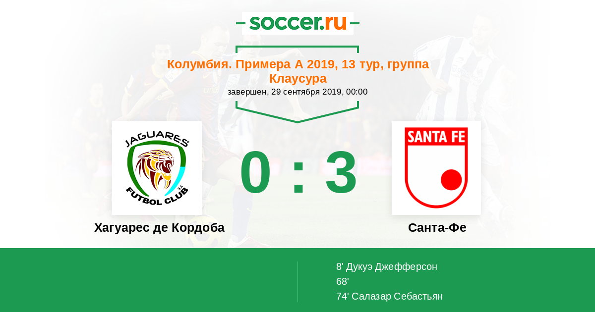 Колумбия. Примера А 01.05.2022 Санта-Фе Логотип футбольный клуб Санта-Фе (Богота) 4:0 Логотип футбольный клуб Хагуарес де Кордоба (Монтерия) Хагуарес де Кордоба