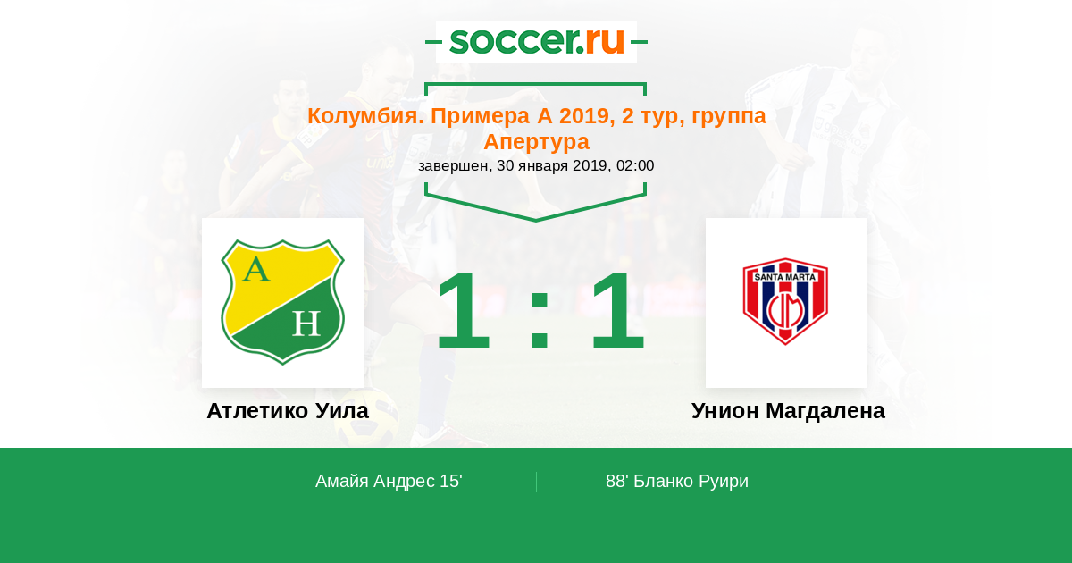 Колумбия. Примера А 20.07.2019 Унион Магдалена Логотип футбольный клуб Унион Магдалена (Санта Марта) 0:0 Логотип футбольный клуб Атлетико Уила (Нейва) Атлетико Уила