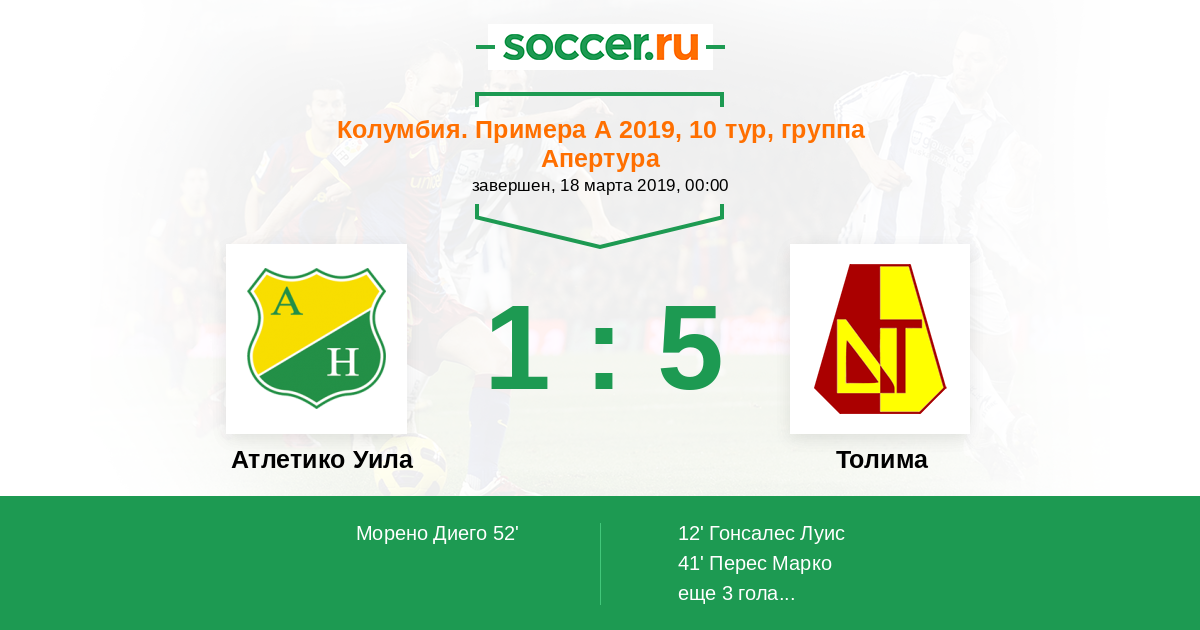 Колумбия. Примера А 19.03.2017 Толима Логотип футбольный клуб Толима (Ибаге) 2:0 Логотип футбольный клуб Атлетико Уила (Нейва) Атлетико Уила