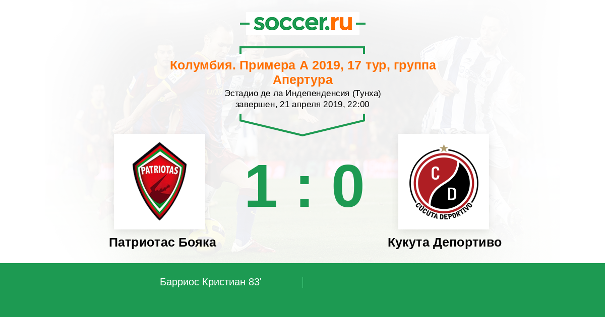 Колумбия. Примера А 14.10.2019 Кукута Депортиво Логотип футбольный клуб Кукута Депортиво 1:0 Логотип футбольный клуб Патриотас Бояка (Тунха) Патриотас Бояка